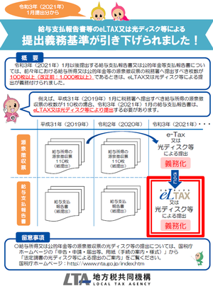 令和3年(2021年)1月以後提出する給与支払報告書又は公的年金等支払報告書については、前々年における給与所得又は公的年金等源泉徴収票の提出枚数が100枚以上であるときは、eLTAX等による提出が義務付けられました。