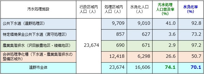 汚水処理人口普及率は、行政区域内人口(遠野市全体の人口)に対する、各汚水処理施設の処理区域内の人口の割合です。
