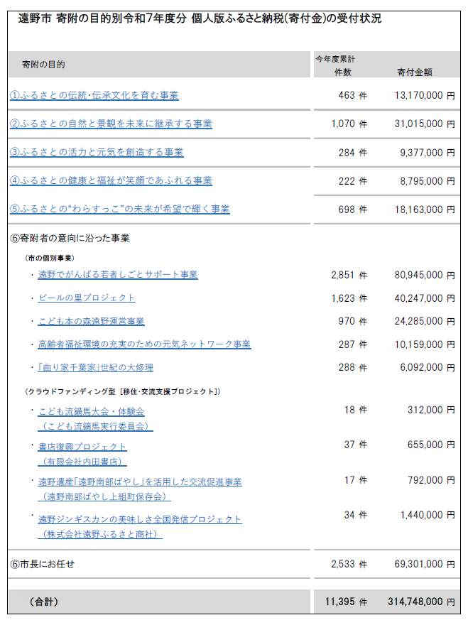 令和7年度 遠野市個人版ふるさと納税の状況 (令和7年4月1日~令和7年11月30日)