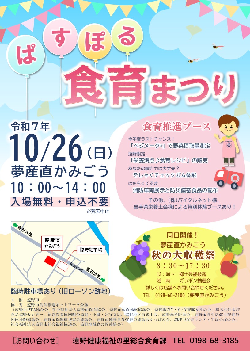 当イベントは、「遠野の食文化」や「食を通した健康づくりと災害への備え」など、様々な体験コーナーを通じて食育を実践するきっかけとなるよう開催します。