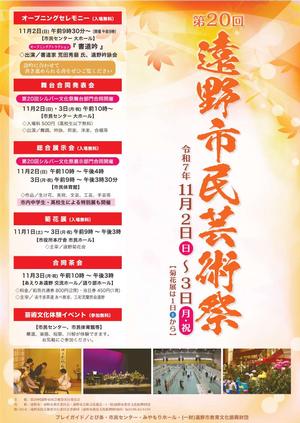 市民による芸術文化活動の成果を発表する場として、地域芸術文化の振興と豊かな地域づくりに貢献することを目的に、遠野市民芸術祭を開催します。