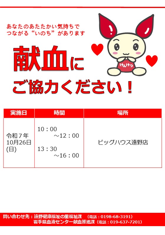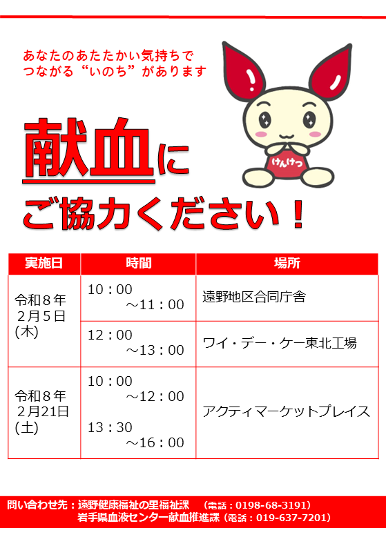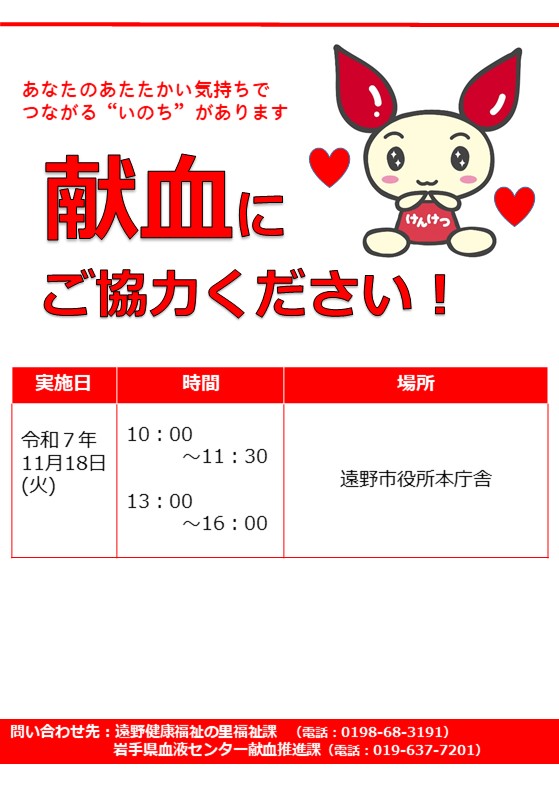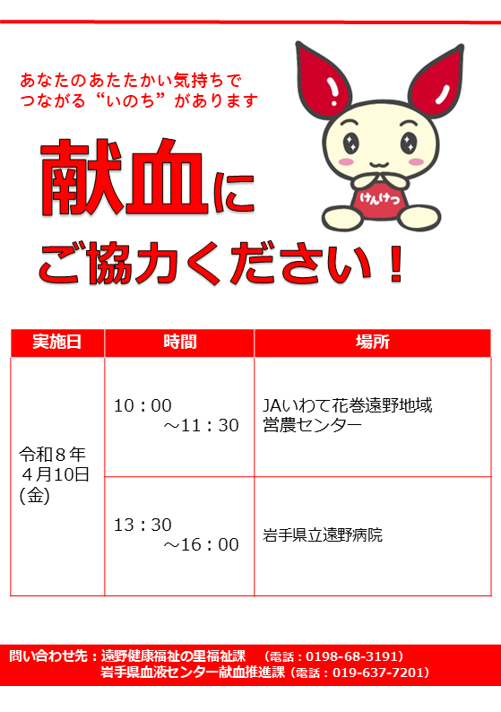 献血会場を離れた後に、気分が悪くなったり、めまいなどを感じた場合には、すぐに安全な場所に座り、頭を低くし、また楽に呼吸ができるように衣服をゆるめるなどして、症状が治まるのを待ってください。症状が回復しにくい場合、または、けがなどのアクシデントにあわれた場合には、すぐに血液センター(盛岡019-637-7204/0120-638-860)まで連絡ください。その他、献血が原因で起こる体調の変化であれば、遠慮なく血液センターまでご連絡ください。