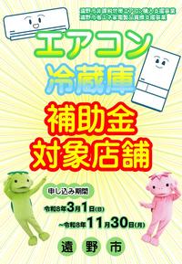 「遠野市省エネ家電製品買換支援事業費補助金」と「遠野市非課税世帯エアコン購入支援事業費補助金」を受けるには、家電購入支援事業協力店から購入する家電(エアコン又は冷蔵庫)であることが必要です。